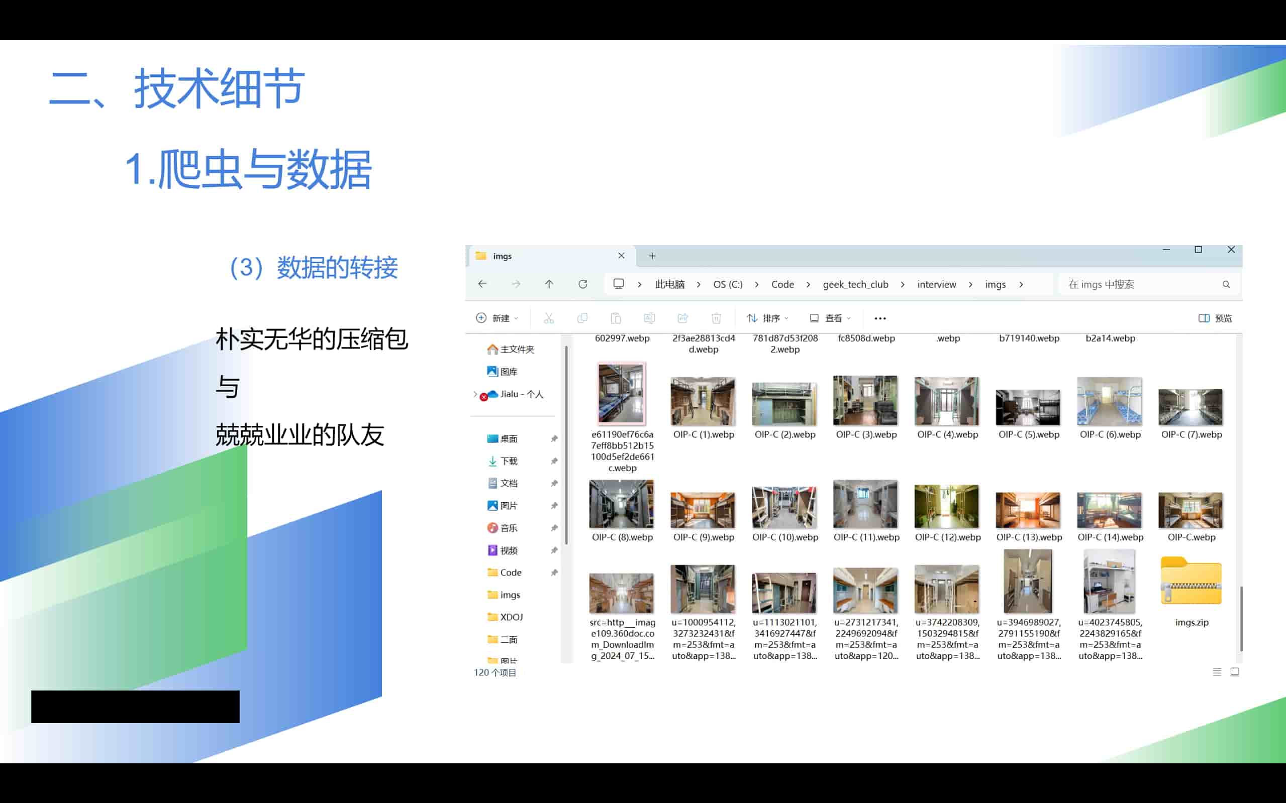 这个说起来的话,也是我第一次和别人合作做一个技术类的项目。在小组长的分配下,我借助deepseek写了个爬虫程序,并在一晚上的运行下,获得了4500多张照片。还是很有成就感的。可是没人知道,当电脑在下面跑了一个晚上的时候,我早就爬上床睡觉了hhh,当时感觉我就是我电脑的奴隶主(